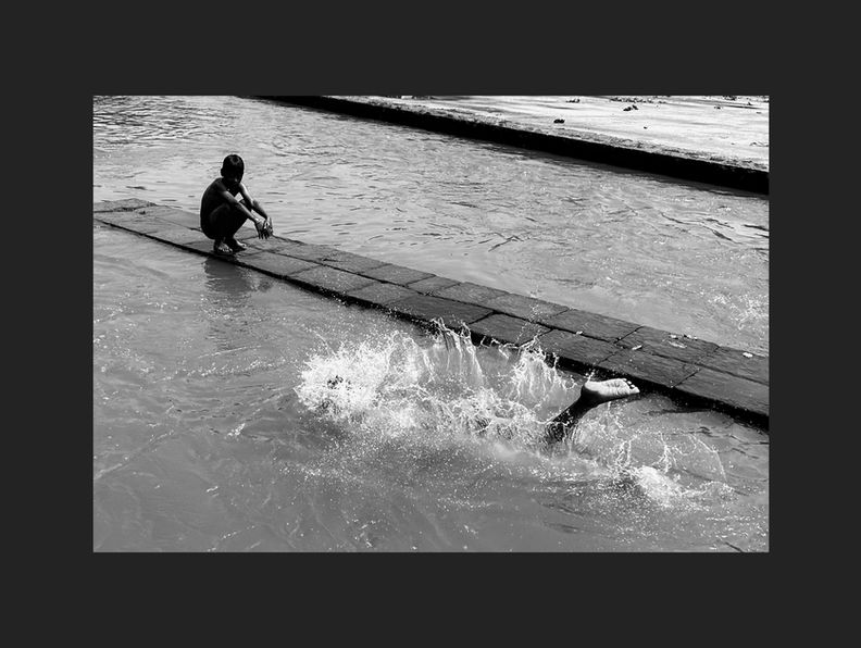 Children by the water capture another register of sound: the explosive splash as one dives in, met by the quiet, contemplative stillness of another watching. Even the smallest details an ant dragging a fragment across concrete hum with a subtle, persistent sound, a whisper of survival. And in the blurred branches of a tree swaying against the sky, I find a ghostly kind of music wind playing an invisible instrument.